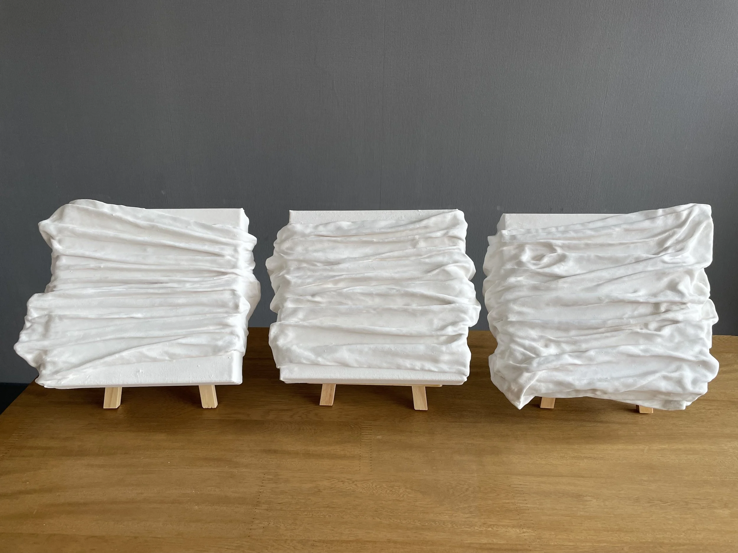 Trio Trio features three pieces.Plaster, Wood Glue & Acrylic Paint on Canvas; 25cm x 25cmUnavailable Contact Kayla to Purchase Your Own Version